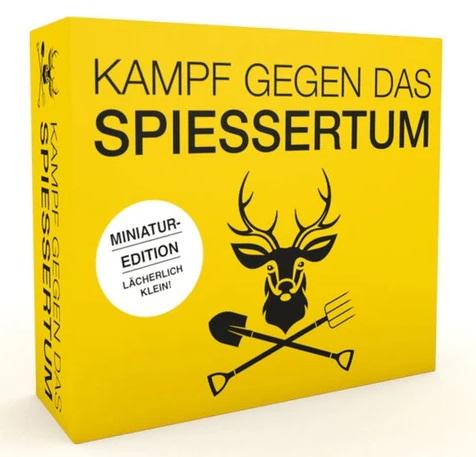 Kampf gegen das Spiessertum Miniatur-Edition Autoren: Angela Vögtli Illustratoren: Angela Vögtli Erscheinungsjahr 2024 Spieler 3 - 10 Spieler Alter ab 18 Jahren Dauer 500 - 30 Minuten Ansehen