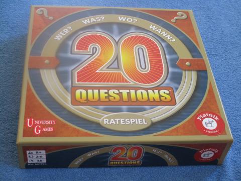 20 Questions ist eines jener Spiele, die in regelmäßigen Abständen neu aufgelegt werden, erstmals erschienen ist es bei MB 1988. Diese Ausgabe enthält 300 aktuell überarbeitete Karten und übernimmt ansonsten die Spielweise des Originals. Man will mit seiner Spielfigur als Erster im Ziel sein; dazu errät man Personen, Orte, Dinge oder Jahreszahlen aufgrund von möglichst wenigen Hinweisen. Jede Karte enthält 20 Hinweise für die Lösung. Ein Spieler ist Vorleser und zieht eine Karte. Die anderen Spieler sind reihum Rater. Der aktive Rater nennt eine Zahl, bekommt den Hinweis mit dieser Nummer vorgelesen und deckt die Nummer auf dem Spielplan mit einem Chip ab. Danach hat er 10 Sekunden für einen Rateversuch und darf nur einen Lösungsversuch nennen. Alle anderen Spieler dürfen NICHT mit raten! Wurde falsch geantwortet, wird der nächste Spieler aktiver Rater. Wurde richtig geraten, werden die 20 Punkte der Karte auf Vorleser und Rater verteilt: Der Vorleser bekommt einen Punkt pro Hinweis, der vorgelesen wurde; der Rater bekommt einen Punkt pro nicht vorgelesenem Hinweis. Jeder der beiden bewegt seine Figur entsprechend. Die Karten können auch Anweisungen an die Spieler enthalten, meist betreffen sie die Bewegung der Figur, können aber auch zusätzliche Rateversuche bringen oder einen Chip, mit dem man raten kann, ohne aktiver Rater zu sein. Auf Bonus-Feldern spielt man eine weitere Karte nach geänderten Regeln. Wer zuerst das Ziel erreicht, gewinnt. Noch immer und immer wieder ein gelungenes Spielprinzip und absolut aktuell, alle Begriffe sind auf dem neuesten Stand und nicht unbedingt aus den üblichen Trivia-Kategorien.