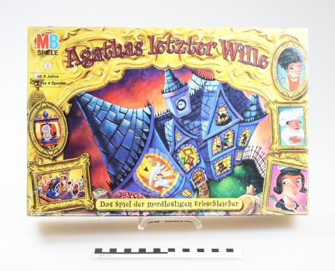 Aufwendig ausgestattetes Detektivspiel um das Testament von Tante Agatha. Erben und gewinnen wird derjenige, der das Haus lebend verlässt bevor die Uhr Mitternacht schlägt. Tödlich sind Kamin, Treppe, Eberkopf, Tresor und Ritterrüstung. Jeder Spieler hat geheim drei Figuren, jeder kann jede Figur bewegen. 2 Würfel bewegen jeweils zwei Figuren. Ein Pasch ermöglicht Auswechseln des Portraits. Auf Fallen zieht man Karten, mit passenden kann man Figuren rauswerfen oder den Detektiv bewegen. Schlägt die Uhr Mitternacht, endet das Spiel. Überarbeitete Neuauflage, Erstauflage 1995, MB