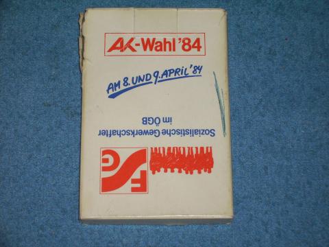 AK-Wahl 84 Kartenblatt mit 9 bis As in Herz, Karo, Pik und Treff In Kartonschachtel, französisches Bild Zur Arbeiterkammerwahl 1984 Dieses Spiel ist in folgenden Sprachen veröffentlicht: Deutsch Ludografische Angaben Verlage: Österrreichischer Gewerkschaftsbund Inventarnummer: 20947 Kategorien: Karten Erscheinungsjahr 1984 Spieler 2 - 4 Spieler Alter 8 - 99 Jahren Dauer bis 30 Minuten