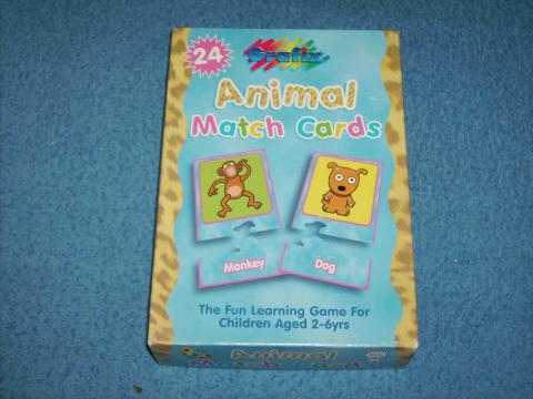 24 zweiteilige Puzzles aus zwei Teilen, auf einem Teil ein gezeichnetes Tier, auf dem anderen der Name des Tiers in Groß- und Kleinbuchstaben, keine Spielregel, nur Anwendungsvorschläge auf der Rückseite.