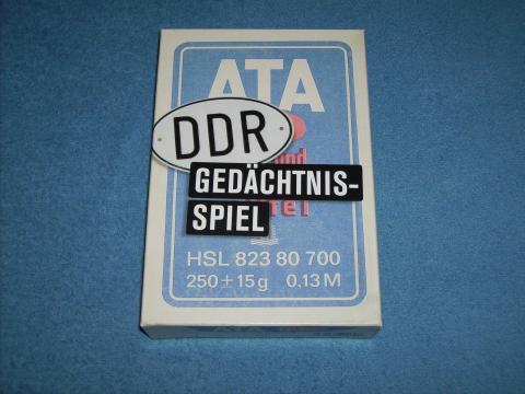 ATA DDR Gedächtnisspiel Merkspiel mit Motiven aus der DDR, Aufmachung und Grafik des Spiels imitieren Werbespiel für ATA, 48 Bildpaare Ludografische Angaben Verlage: VEB Inkognito Inventarnummer: 18317 Kategorien: Merken, Sammeln, Werbe Spieler 2 - 8 Spieler Alter 8 - 99 Jahren Dauer bis 30 Minuten