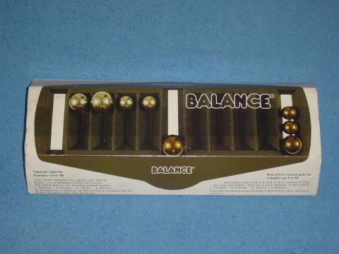 Spielbrett mit 8 Sektoren und einer neutralen Zone in der Mitte und Startzonen an meiden Enden; jeder Spieler hat 4 Kugeln, 2 kleine, eine mittlere und eine große, mittlere und große sind doppelt bzw. dreimal so schwer wie die kleinen. Verschiedene Varianten angegeben: Balance Studium – ein Spieler stört das Gleichgewicht, der andere hat zwei Züge um es wiederherzustellen. - Balance Fortuna – die Spieler bewegen Kugeln nach Würfelwurf, der letzte Zug muss das Gleichgewicht wiederherstellen. Balance Tactica – es wird gleichzeitig gewürfelt, jeder kennt so die Anzahl der Züge die der andere zur Verfügung hat. Balance Mystica – gegnerische Kugeln werden entfernt, es wird ebenfalls für die Anzahl der Züge gewürfelt.