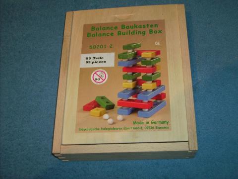 Balance Baukasten Baukasten mit verschieden großen Quadersteinen, die Steine haben Löcher, in die Kugeln gelegt werden, auf die wieder Quader gelegt werden. Ohne Spielanleitung, nur mit Abbildung am Deckel. Ludografische Angaben Verlage: Erzgebirgische Holzspielwaren Ebert Inventarnummer: 18293 Kategorien: Lernen Spieler 1 - 4 Spieler Alter 6 - 99 Jahren Dauer bis 20 Minuten