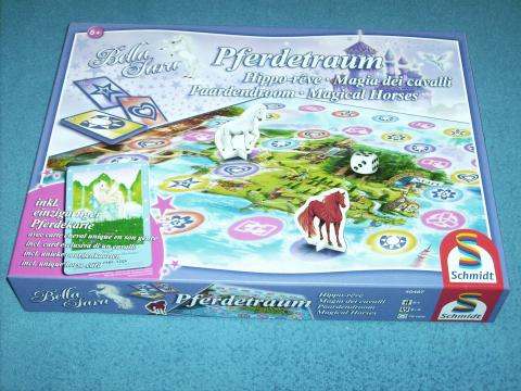 Bella Sara ist eigentlich ein Sammelkartenspiel, bei dem die Karten sammelt und mit Codes auf den Karten im Internet in der Welt von Bella Sara spielen kann, man besitzt die entsprechenden Pferde, kann sie pflegen, füttern, auf ihnen reiten und Abenteuer erleben. Pferdetraum bringt diese Welt nun aufs Spielbrett, es enthält auch eine Bella-Sara-Karte zum Sammeln. Die Spieler reiten mit den Pferden Bella, Thunder, Jewel und Fiona durch ds Land des Hohen Nordens oder um das Wolkenschloss und sammeln Schätze. Wer zuerst 3 passende Schatzkarten Sets gesammelt hat, gewinnt. Wer dran ist würfelt und zieht das Pferd vorwärts, die Richtung ist frei wählbar. Liegt eine Schatzkarte in der Farbe des erreichten Feldes aus, kann man die Karte nehmen, auf einem Sonderfeld darf man sich eine Karte aussuchen. In jedem Fall wird eine Karte vom Stapel nachgelegt. Spielt man mit der Planseite Im Land des Hohen Nordens, müssen die Farbe und die Schatzart von Feld und Karte übereinstimmen, damit man sie nehmen darf. Es gibt mehrere Sonderfelder:Man darf sich eine offene aussuchen oder eine vom Nachziehstapel nehmen und alle geben verdeckt eine Karte weiter und alle Karten in der Mitte werden ausgetauscht oder man tauscht eine Handkarte gegen eine Karte aus der Mitte. Für Spieler, die Sammelkarten von Bella Sara besitzen, gibt es eine dritte Möglichkeit: man kann die Pferde statt mit dem Würfel auch mit den Symbolen auf den Karten bewegen, es müssen aber Pferdekarten sein. Ein hübsches Spiel mit Standard-Lauf/Sammel-Mechanismus, speziell nur durch das Thema.