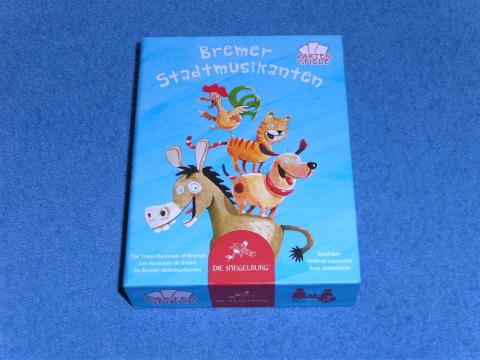 Im Programm von „Die Spiegelburg“ gibt es eine neue Reihe von Kartenspielen. Zum Start der Serie gibt es vier Titel: Affenzirkus, Bremer Stadtmusikanten, Monster-Alarm und Rasend Schnell. Bei Bremer Stadtmusikanten müssen die Tiere einander wie im Märchen auf den Rücken springen. Im Spiel sind Karten mit den Tieren aus dem Märchen, entweder in rotem, grünem, gelbem oder blauem Rahmen, immer zwei Tiere mit verschiedenem Rahmen auf einer Karte. Man legt Tiere in der Reihenfolge Esel-Hund-Katze übereinander, immer nur Tiere mit gleichem Rahmen aufeinander. Tiere haben übrigens denselben Hintergrund wie Rahmen, nur der Hahn hat grauen Hintergrund und farbige Rahmen. Man darf auch beide Hälften einer Karte abdecken, wenn man beide Kartenhälften passend abdecken kann. Wer den Hahn spielt, zieht danach eine Karte und sucht sich ein Tier davon aus. Dann gibt er die Karte dem Nachbarn – hat dieser das genannte Tier, darf er eine Karte dazulegen und beide an den nächsten Nachbarn weitergeben. Hat dieser auch das gesuchte Tier, gibt die Karten weiter usw. Wer die gesuchte Karte nicht hat, muss alle Karten nehmen und ist dann für einen normalen Spielzug an der Reihe. Wer die vorletzte Karte legt, muss das mit dem Geräusch eines der Tiere auf der verbliebenen Karte melden oder eine Karte ziehen. Wer kein passendes Tier legen kann, zieht auch eine Karte. Wer alle Karten ablegen kann, gewinnt. Bremer Stadtmusikanten bietet eine entzückende Variante des Domino-Prinzips, Spieler lernen nichtlinear anzulegen, und selten passen Mechanismus und Thema so gut zusammen wie hier.