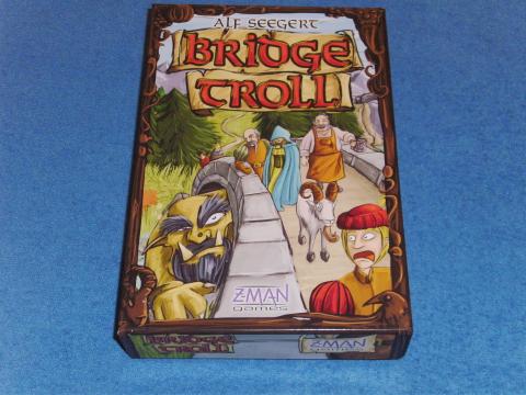 Als Trolle bewachen wir eine Troll Brücke. Täglich wollen Reisende die Brücke nutzen und wir rivalisieren mit unseren Mit-Trollen um die Reisenden. Die Auslage wird vorbereitet und der Reise-Plan entsprechend der Spieleranzahl ausgelegt. Das Spiel verläuft in Runden: Zuerst wirft der Startspieler den Würfel und bestimmt das Wetter und damit die Anzahl der Reisenden. Eine Karte dafür wird verdeckt gelegt, die anderen offen. Dann können alle mit ihren Felsbrocken um die Wahl unter den Reisenden bieten. In Reihenfolge ihres Gebots beginnend mit dem höchsten nehmen alle den entsprechenden Trophäenmarker samt Bonus-Marke. Wer nicht geboten hat, markiert seine Brücke als „geschlossen“. Dann nehmen alle mit offener Brücke in Reihenfolge der Trophäenmarker einen Reisenden, man darf nicht passen und muss die Karte sofort verwerten. Dazu legt man sie in den Nahrungsvorrat oder zur Maut. Dann bekommen alle einen Anteil an den gebotenen Felsbrocken; in umgekehrter Marker-Reihenfolge wählen alle ein Gebot für ihren Vorrat. Wer nicht geboten hat, bekommt Brocken aus dem allgemeinen Vorrat entsprechend der Zahl auf dem Reise-Plan. Dann kann man Karten aus dem Nahrungsvorrat oder der Maut gegen Punkte tauschen oder damit die Brücke ausbauen. Geschlossene Brücken werden mit Felsbrocken ausgebaut. Gibt es nicht mehr genug Reisende-Karten gewinnt man mit der höchsten Summe aus Brückenausbau und Wertungsmarkern. Bridge Troll ist ein lupenreines Ressourcen-Management-Spiel mit Versteigerung, attraktiv getarnt durch das Fantasy-Thema, durch die Wechselwirkungen der Karten um einen Tick zu komplex für ein Familienspiel.