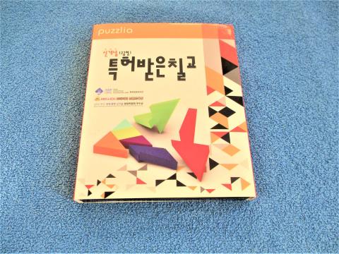 Tangram Variante mit miteinander verbundenen Teilen, die gegeneinander verdrehbar sind, sodass auch 3D-Strukturen möglich sind. Ohne Vorlagen oder Aufgaben. Teile je zwei verbundene Dreiecke Größe 1 als Dreieck Größe 2 in blau und orange, zwei einzelne Dreiecke Größe 1 in Lila und Hellblau, ein Quadrat aus zwei Dreiecken Größe 1 in gelb sowie zwei Rauten, rot und grün, aus je zwei Dreiecken der Größe 2.