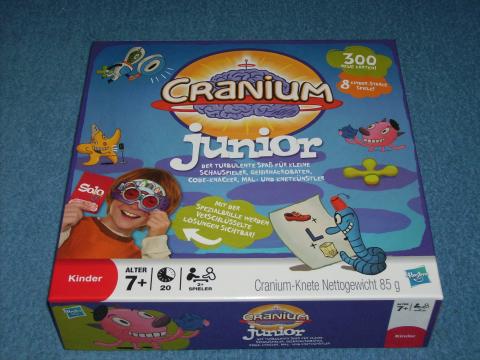 Das Kreativ- und Kommunikationsspiel mit einer Mischung aus Elementen von Activity und Barbarossa hat nun bei Hasbro eine neue Heimat gefunden, vorerst werden zwei Ausgaben neu aufgelegt: In der Cranium Familien-Edition des Spiels heißen die Kategorien KreatoKater in Blau, DenkOnaut in Rot, StarSteller in Gelb und WörterWurm in Lila. Die Spieler bilden zwei Teams, man bekommt vom gegnerischen Team eine Aufgabe aus der Kategorie in der Farbe, auf der die Spielfigur des Teams steht. Das aktive Team bestimmt einen Ausführenden, die anderen müssen gegebenenfalls raten oder erkennen, was dargestellt wird. Spielziel ist das Mittelfeld, wer die Aufgabe schafft, bevor die Zeit abgelaufen ist darf würfeln und entsprechend weiterziehen. Wer zuerst die Ziellinie überquert, hat gewonnen. Cranium junior ist speziell für Kinder gedacht. Man erwürfelt eine Solo- oder eine eine Team-Karte und liest sie vor. Wer eine Solo-Aufgabe löst, darf einen Stein aufs Spielfeld setzen. Wer als aktiver Spieler eine Team-Aufgabe bekommt, setzt auch einen Stein, wer die Lösung wusste, setzt einen oben drauf, beide Spieler können das Feld nützen. Für Lösungen oder Aufgaben kommt eine Spezialbrille für den Geheimcode zum Einsatz. Wer mit seinen Steinen zuerst irgendeine 4er-Reihe bildet, gewinnt. Der letzte Stein der Reihe muss mit einer Solo-Karte gesetzt werden. Kann niemand eine Viererreihe bilden, wird gespielt, bis alle Felder am Brett besetzt sind, und es gewinnt, wer die meisten Steine am Brett hat. Nach wie vor gut, witzig und kreativ, auch in der Junior-Ausgabe mit völlig neuen Fragen und Aufgaben ein gelungener Spielspaß für die ganze Familie