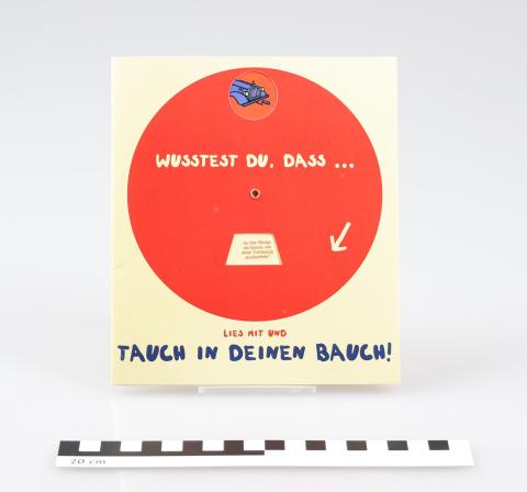 Broschüre zu Magen, Darm, Verdauung Spiel ist Teil der Broschüre, Spielfiguren zum Ausschneiden. Mechanismus Lauf/Würfelspiel, man würfelt und zieht, befolgt die Anweisungen auf Ereignisfeldern, wer am schnellsten durch das Verdauungssystem läuft, gewinnt.