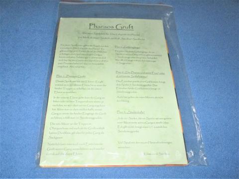 Vier neue Pläne als Ergänzung zum Grundspiel Das Labyrinth des Pharao: Pharaos Gruft, Geheimgänge, Der Pharao und seine Frau sowie Säulenhalle. Man hat 28 Kärtchen, alle legen in einem Zug jeweils das gleiche Kärtchen und versuchen in der Pyramide einen Gang zu bauen. Für jeden der vier Pläne gibt es Zusatzregeln für Gänge und Mauern.
