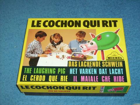 Jeder Spieler hat ein vollständig zerlegtes Schwein, man muss eine Sechs würfeln um beginnen zu können, dann muss man eine Eins haben um weitere Körperteile ansetzen zu können, wer zuerst sein Schwein beisammen hat, gewinnt. Spiel existiert seit 1932, keinerlei Informationen auf der Schachtel, nur Titel in sechs Sprachen und auf dem Schachtelboden die Regeln in englisch und französisch. Unter der französischen Regel steht noch R.C.Bourg und eine Nummer, möglicherweise der Autor