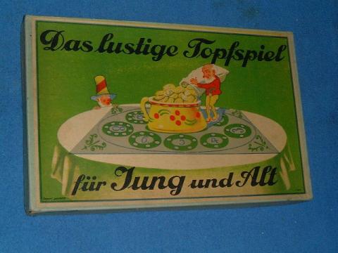 Glücksspiel mit Würfel, jeder Spieler hat einen Wurf mit 2 Würfeln und setzt auf eine Zahl, sind alle Kreise einer Zahl besetzt, darf derjenige, der diese Zahl würfelt, den Einsatz einziehen, bei einer 7 muss in den Topf eingezahlt werden, die 12 bekommt den Inhalt des Topfes.