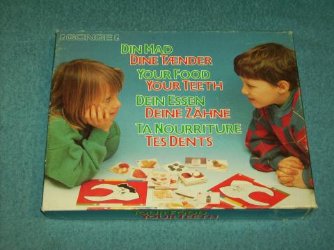 Legespiel mit 36 Kärtchen für gesundes und ungesundes Essen, dazu drei Tafeln mit gesunden und drei Tafeln mit kranken Zähnen. Man kann damit Lotto oder Memo spielen, die Spieler entschieden, welches Essen gesund und welches ungesund ist, wer zuerst seine Tafel korrekt belegt hat, gewinnt. Viersprachige Ausgabe, Artikelnummer von website