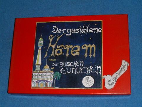 Damit die Erwachsenen nicht traurig sind, weil nur die Kinder so schöne Spiele haben, dürfen sie hier die falschen Eunuchen suchen, d.h. die echten Fürsten, die sich als Eunuchen verkleidet an die schönen Damen heranmachen. Auch hier ist alles Material selbst gemacht und die Karten sind handkoloriert! Der Spieler am Zug würfelt mit 6 Würfeln und muss versuchen möglichst schnell durch Rechenoperationen mit den erwürfelten Zahlen die Zahl 6 zu bilden, schafft er es, darf er sich eine Haremsdame unterziehen. Der Wachhabende der Runde kommt ins Spiel, wenn sich der Spieler am Zug verrechnet, dann muss er rechnen und schneller sein und dann muss der Spieler am Zug alle davon überzeugen, dass er ein echter Eunuch ist. Sind alle Haremsdamen verteilt, gewinnt der Spieler mit den meisten Damen.