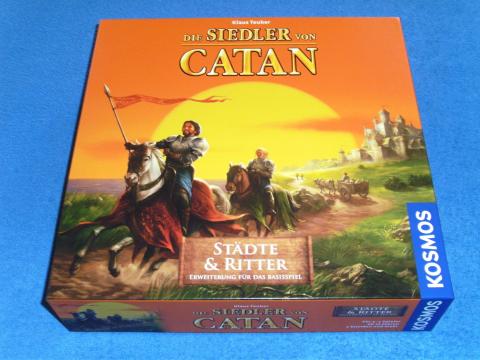 Wie im Grundspiel und allen bisherigen Erweiterungen geht es darum, als Erster eine vorgegebene Anzahl von Siegpunkten zu erreichen. Diese Siegpunkte bekommt man durch den Bau von Straßen und Siedlungen, aber auch durch neue Elemente, die aus dem Kartenspiel ins Brettspiel übertragen wurden. Für eine Stadt an einem Rohstofffeld gibt es nun bei Wolle, Holz und Erz eine rohstoffspezifische Handelswarenkarte. Damit kann man seine Städte in drei Bereichen entwickeln: Mit Holz bzw. Papier gibt es kulturellen Fortschritt, mit Wolle = Tuch wirtschaftlichen Fortschritt und für Erz = Geld erhöht man politische Stärke, alles mit Aktionskarten, die bei gezieltem Einsatz Spiel entscheidend sein können. Die Ritter werden mit Rohstoffen aktiviert, können Handelsstraßen unterbrechen, fremde Ritter zurückhalten, Räuber verjagen und die Barbaren stoppen. Diese Barbaren sind neu, sie kreuzen vor den Küsten Catans und die Städtebauer müssen eine entsprechende Verteidigungsmacht stellen. Wer sich daran nicht oder nur ungenügend beteiligt, riskiert Verlust einer Stadt, wer die meisten Ritter einsetzt, bekommt einen Siegpunkt. Neuauflage in neuer Gestaltung zum 15-Jahr-Jubiläum des Grundspiels.