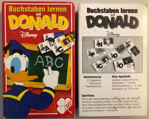 Disney Buchstaben lernen mit Donald Lernspiel zu Buchstaben auf Domino-Basis, 27 Karten zeigen Bilder und dazu die entsprechenden Anfangsbuchstaben Ludografische Angaben Verlage: Klee-Spiele GmbH Inventarnummer: 17808 Kategorien: Lernen Spieler 1 - 4 Spieler Alter 5 - 12 Jahren Dauer bis 15 Minuten