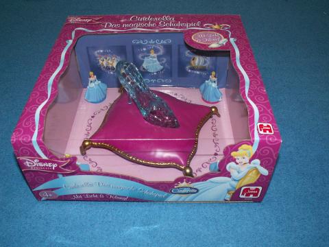 Aschenputtel will zum Ball und muss dazu Pferde, Kutsche, Kutscher, Diener, Kleid und Einladung sammeln. Der Spieler am Zug würfelt und zieht sein Aschenputtel, auf farbigen Feldern darf man die entsprechende Karte nehmen, wenn man sie noch nicht hat, auf Feenfeldern drückt man auf den Gläsernen Schuh – ertönt eine Melodie, darf man eine Karte umdrehen und damit in einen der benötigten Gegenstände verzaubern. Ertönen die Glocken, hat man Pech gehabt und der Nächste ist dran. Wer alle Gegenstände verzaubert hat, gewinnt.