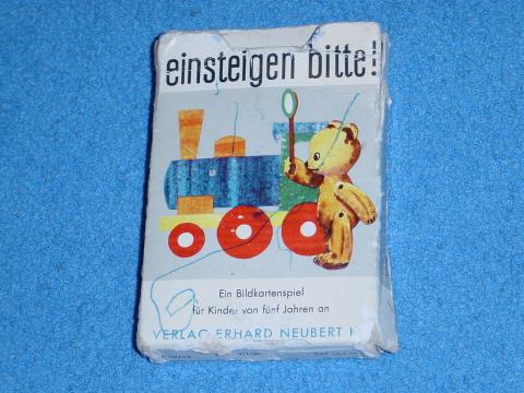33 Bildkarten, jeweils mit Eisenbahnwaggon verschiedenster Gestaltung, mehrere Spielmöglichkeiten angegeben. Auch als Lernspiel für die Bezeichnung der Illustrationen wie Signalmast oder Bahnhof zu verwenden.
