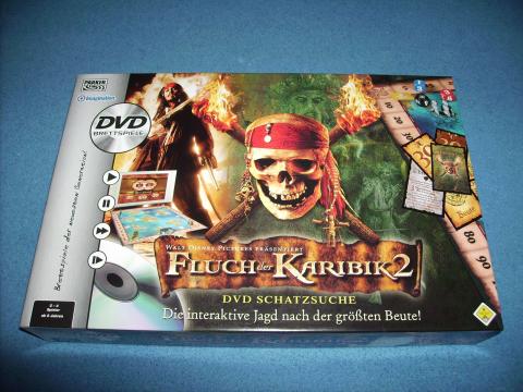 Die Spieler beginnen mit ihrem Schiff im passenden Heimathafen, jeder bekommt 3 Beutekarten, 1 Glückskarte und 1 Schatzsuchekarte. Die Schatzsuchekarte zeigt dem Spieler, welche Beute er sammeln und unter dem Punkt X vergraben muss. Um die Beute zu sammeln besucht man so viele Inseln wie möglich, um dort interaktive DVD-Spiele zu spielen oder gegen andere Piraten zu kämpfen und deren Beute zu kapern. Wer dran ist wirft den Bewegungswürfel und kann maximal die entsprechende Punkteanzahl ziehen, aber auch früher stoppen. Für das Passatsymbol wird die DVD konsultiert. Auf dem erreichten Feld darf man mit Hilfe der DVD durch Eingeben der Koordinaten das Feld durchsuchen und dementsprechende Anweisungen ausführen. Man kann auch gegen ein anderes Schiff kämpfen, dazu benutzt man Glückskarten und die Kampfwürfel, oder aber auch gar nichts machen und einfach auf dem erreichten Feld stehen bleiben. In den Häfen der Inseln stellt die DVD spezielle Aufgaben. Wer die Fluchkarte Der schwarze Fleck erwischt, muss ihn brechen, bevor er den Schatz vergraben kann, entweder durch Spielen einer entsprechenden Karte oder durch Anlegen im Heimathafen. Hat man die Beute beisammen, gibt die DVD den Ort vor, wo die Beute vergraben werden muss, der Spieler muss sein Schiff dorthin ziehen. Verliert er unterwegs Beute, muss er neue sammeln und sich ein neues Versteck von der DVD geben lassen. Fluch der Karibik 2 DVD Schatzsuche vermittelt gut das Flair des Piratenthemas, die Interaktion mit der DVD macht Spaß ohne das Brettspiel zu dominieren oder zu verdrängen, eine sehr gelungene Kombination.