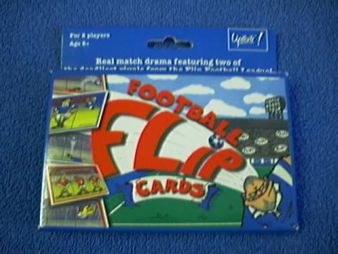 FOOTBALL FLIP CARDS Kartenspiel zum Thema Fußball für 2 Spieler ab 6 Jahren Die Karten sind beidseitig bedruckt, die Torhüterkarten haben z.b. Elfmeter-Schüsse auf der Rückseite. Ludografische Angaben Verlage: UPSTARTS USA Inventarnummer: 10013 Kategorien: Karten, Sport Erscheinungsjahr 1998 Spieler 2 - 2 Spieler Alter 6 - 99 Jahren Dauer bis 45 Minuten