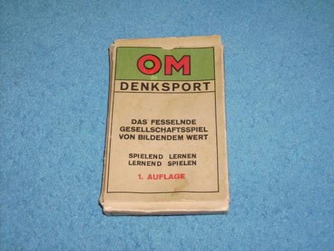 32 doppelseitig bedruckte Karten mit Fragen, gespielt wird in zwei Durchgängen mit je 16 Karten, für jede sinngemäß richtig beantwortete Frage gibt es einen Gutpunkt. Interessant ist das Design der Karten, die untere Kante hat links und rechts eine Nase zum leichteren Zusammenordnen der Karten. 1. Auflage