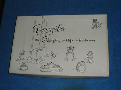 Das Spielbrett = Porzellanladen hat Felder für verschiedene Geschirrteile, teils mit, teils ohne Henkel, teils auf Podesten, teils direkt aufs Spielbrett. Dann bekommt jeder eine gewisse Summe Spielkapital, die gleiche Summe geht an die Bank. Und dann kommt Pompo, eine Elefantenmarionette, die jeder im Rahmen seines Spielzuges vom leeren Mittelfeld des Spielbrettrandes ins Porzellangeschäft führt und versuchen muss, damit Geschirrteile am Rüssel aus dem Laden zu tragen. Hinuntergeworfenes Geschirr muss man aus dem Spielkapital bezahlen, erfolgreich hinausgetragenes Geschirr erhöht das Spielkapital entsprechend. Hat Pompo nicht wenigstens ein Bein am Boden oder fällt Geschirr, endet der Zug. Erfolgreich erobertes Geschirr bleibt im Besitz des Spielers, hinuntergeworfenes wird bezahlt und für den nächsten Spieler wieder aufgestellt.