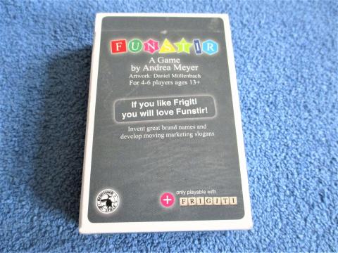 Erweiterung zu Frigiti und nur mit Frigiti spielbar. Die 52 Karten der Erweiterung tragen je zwei Werbesprüche, mit mindestens drei Würfelresultaten von drei Würfeln mit Vokalen und sieben Würfeln mit Konsonanten soll man nun einen Markennamen erfinden. Es muss ein Name sein, denn es NICHT gibt! Dann werden Definitionen dazu notiert, die Zettel gemischt und neu verteilt und Definitionen vorgelesen; jeder markiert beim Vorleser seine Definition und di beiden, die ihm am besten gefallen haben, dafür gibt es dann Chips für den Verfasser. Nach so vielen Runden wie Mitspieler gewinnt man mit den meisten Chips.