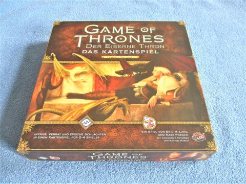 Auf Basis von Roman und Brettspiel verkörpert man eines der sechs großen Häuser von Westeros und liefert einander mit bekannten Charakteren Militär-, Intrigen- und Machtkämpfe. Das Grundspiel enthält alles Nötige für ein Spiel zu viert, und zwar Grundsets für die Häuser Lannister, Stark, Targaryen und Baratheon; man beginnt mit sieben Handkarten und eine Runde besteht aus Thema = Plot, Ziehen, Versammeln, Herausforderungen, Dominanz, Status und Steuern. Wer als Erster 15 Machtpunkte ansammelt, gewinnt. Die Neuauflage bietet ein verbessertes Spielerlebnis und basiert auf der Originalausgabe von GoT Der Eiserne Thron Das Kartenspiel. Version: de * Regeln: de en * Text im Spiel: ja