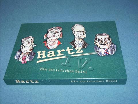 Würfelspiel zum Thema Hartz IV, Arbeitslose und Arbeitsmarkt. Jeder beginnt mit 345 Teuro, wer eine 6 würfelt beginnt, alle roten Felder Richtung Ziel müssen mit genauer Augenzahl erreicht werden und dürfen nicht übersprungen werden. Auf den roten Feldern nimmt man eine Karte auf und liest sie vor, je nach Karte bekommt oder verliert man Geld und erhält Anweisungen bezüglich weiterer Spielzüge – man kann eine zweite Karte als Ersatz ziehen, diese muss man befolgen. Erreicht man besetzte Felder, kann man den Spieler hinauswerfen oder dieser macht ein Angebot zu Freikauf oder Dienstleistung. Wer hinausgeworfen wird, geht zurück an den Start. Geht jemand pleite, scheidet er aus, wer am Zielpunkt die meisten Teuros überhat gewinnt, Supergewinner ist, wer auf den 1. Arbeitsmarkt zurückkehren kann.