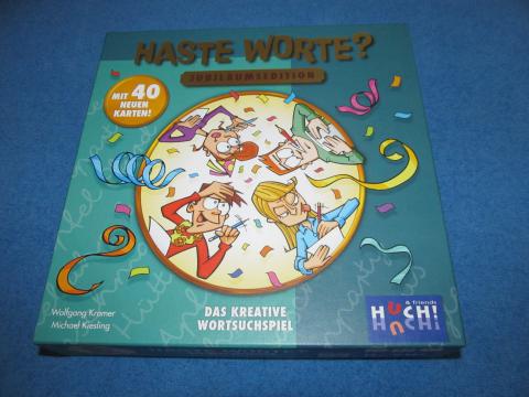 Wortsuche im Zeitlimit in dieser Neuauflage, die als Jubiläumsedition zu 20 Jahre Erstauflage bei F.X. Schmid 1997 erscheint. Die neue Ausgabe enthält 40 neue Karten, darunter Vetokarten, Doppelte-Punkte-Karten sowie neue Handicap- und Aufgabenkarten. Auf dem Plan mit Startfeld für die Spielerfiguren und 34 Feldern der Laufstrecke sind die letzten 12 Felder mit Rufzeichen markiert. Jeder bekommt noch eine Doppelte-Punkte-Karte und eine Veto-Karte sowie sechs Tippkarten im Wert 1 bis 6. Die Spieler einigen sich auf eine Zahl zwischen 1 und 10 für das gesamte Spiel; der Spielleiter liest die entsprechende Aufgabe vor - einmal im Spiel kann man eine Aufgabe mit Veto-Karte ablehnen. Alle Spieler notieren möglichst viele Begriffe zur Aufgabe. Ist die Zeit abgelaufen, bietet man mit Zahlenkarte auf die Anzahl Worte, die man in seinem Zug wird vorlesen können, man kann auch mehrere Zahlenkarten dazu verwenden. Wer am niedrigsten bietet, beginnt und liest vor, alle streichen vorgelesene Worte bei sich. Kann man so viele Worte vorlesen wie man gewettet hat, zieht man seine Figur entsprechend vor. Einmal im Spiel kann man die Doppelte-Punkte-Karte einsetzen und bei korrekter Wette die doppelten Punkte ziehen. Steht der Führende auf einem Rufzeichenfeld, bekommt er für die Runde ein Handicap laut Karte, z.B. „Nur Worte mit weniger als 6 Buchstaben“. Der Erste im Ziel gewinnt. 20 Jahre und kein bisschen veraltet, im Gegenteil, noch immer aktuell und sehr, sehr gut; der Bietmechanismus gibt auch ein wenig Strategie vor, man liest natürlich eher Worte vor, die die anderen auch haben könnten. Stadt-Land-Fluss mit Pfiff!