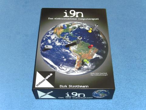 i9n steht für Information. Man soll mit 2 Forschern Informationen zu Ölquellen finden, deren Anzahl sich in jeder der 6 Phasen halbiert, Positionen muss man mit Bohrungen herausfinden. Die Bohrungen muss man mit Aktienhandel finanzieren. Die Lochkarten tragen auf der Rückseite Informationen. In jeder Phase wird eine Karte unter die Platte geschoben, und das halbiert so die Anzahl verfügbarer Quellen. Man würfelt, zieht den Forscher, handelt mit Aktion und bohrt am Forscherstandort nach Öl. Kommt man zum Prozessorboden durch, hat man eine Quelle gefunden. Am Ende gewinnt man mit den meisten Punkten aus Ölquellen und Aktien.