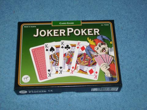 Die Spieler bekommen 15 bzw. 13 Karten und einen Satz Bietkarten einer Farbe, jeder Satz besteht aus einer 0 und einer 4 sowie zwei 1ern, drei 2ern und zwei 3ern. Jeder Spieler ordnet seine Handkarten zu 3 Kombinationen aus je fünf Karten, entsprechend den gängigen Poker-Kombinationen, die wertvollste links, die schwächste Hand rechts und legt sie verdeckt aus. Spielen vier Spieler, haben sie nur 13 Karten bekommen und bilden die schwächste Hand nur mit 3 Karten. Dann wählt jeder Spieler aus seinen Bietkarten entsprechend der Stärke seiner Poker-Kombinationen drei Karten aus und legt je eine verdeckt unter jede der Pokerhände. Dann wird von allen Spielern gleichzeitig die 1. Hand aufgedeckt, wer die Poker-Kombination mit dem höchsten Wert ausliegen hat, bekommt alle auf Hand 1 gesetzten Bietkarten einschließlich der eigenen. Ergibt sich ein Gleichstand, bekommen die Beteiligten ihre Bietkarte zurück, die anderen gehen aus dem Spiel. Danach werden analog Hand 2 und Hand 3 aufgedeckt und gewertet. Der Gesamtwert der gewonnenen Bietkarten eines Spielers sind am Ende die Siegpunkte. Zu den normalen Karten sind drei Joker im Spiel, ein schwarzer, ein roter und ein Universal-Joker. Joker können Karten ihrer Farbe ersetzen, der Universaljoker alle Karten, pro Kombination nur 1 Joker ist nur ein Joker erlaubt. Nach drei Runden gewinnt der Spieler mit der höchsten Summe. Joker Poker ist eine fröhliche Pokervariante für den Familientisch mit Anklängen von Rummy, die Joker machen das Bieten ziemlich unberechenbar, aber es macht Spaß und manchmal punktet die schwächste Hand.