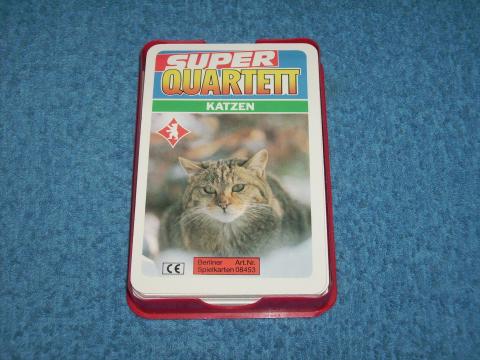 32 Karten, mit Informationen zur jeweiligen Katzenrasse Kartenrückseite schwarz, darin Smileys schwarz auf weiß, offener Mund und schattierte Wangen Dose, flach, rot