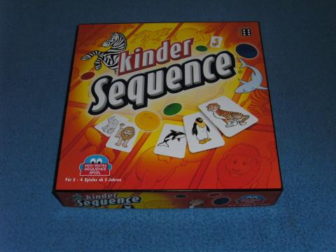 Sequence ist ein Spiel um Sequenzen, das heißt Folgen – man spielt Karten aus, um Felder auf dem Plan zu besetzen und als erster eine Reihe aus vier Markern der eigenen Farbe entweder waagrecht oder senkrecht oder diagonal abzulegen. Kinder Sequence folgt dem gleichen Spielprinzip, aber mit Tierbildern statt Spielkartenmotiven. Auf dem Spielplan gibt es 2 x 19 Felder mit Tieren: Tiger, Strauß, Wal, Elefant, Löwe, Panda, Schildkröte, Waschbär, Hai, Känguruh, Zebra, Pinguin, Rentier, Krokodil, Giraffe, Nilpferd, Fuchs, Kamel und Gorilla. Jedes Tier ist zweimal abgebildet, die Eckfelder sind ohne Bild, es sind Freifelder für alle Spieler. Man spielt eine Karte aus und legt einen eigenen Farbchip auf ein freies Bild dieses Tiers auf dem Spielplan. Ist kein Feld mit dem auf der Karte abgebildeten Tier mehr frei, legt man die Karte ungenutzt ab. Zu den Spielkarten mit den Tierbildern gibt es noch zwei Arten von Sonderkarten – Drachenkarten und Einhornkarten, für diese Karten gibt es keine Felder am Plan. Spielt man eine Drachenkarte, kann man einem Gegner einen ausgespielten Stein vom Brett nehmen. Mit einer Einhornkarte darf man einen eigenen Stein auf ein beliebiges freies Feld legen. Die Eckfelder sind Freifelder für alle, jeder kann diese Felder als Teile seiner Viererfolge nutzen. Wer als erster eine gerade ununterbrochene Viererreihe aus eigenen Markern auslegen kann, sagt „Sequence“ und gewinnt das Spiel. Eine hübsche kindgerechte Variante von Sequence, Spielspaß und Spielprinzip blieben voll erhalten, eine gelungene Erweiterung der Sequence-Spielefamilie.
