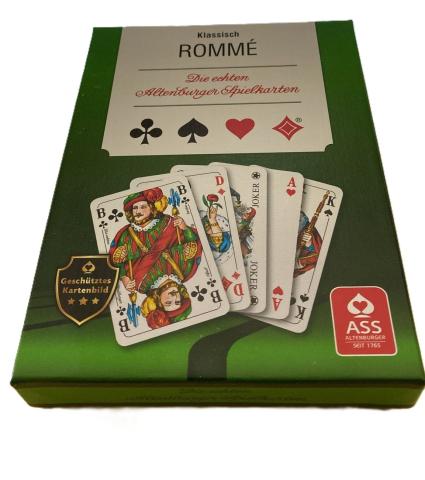 Klassik Rommé 2 x 55 Spielkarten – Ass, König, Dame, Bube, 10-1 in Karo, Herz, Pik und Kreuz, + 3 Joker, französisches Bild Dieses Spiel ist in folgenden Sprachen veröffentlicht: Deutsch Ludografische Angaben Verlage: ASS Altenburger Inventarnummer: 32453 Kategorien: Karten, Spielesammlung, Klassiker Spieler ab 2 Spielern Alter 6 - 99 Jahren Dauer bis 45 Minuten