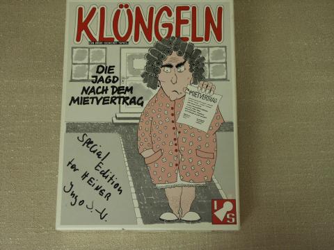 Spiel zum Thema wohnen und Mietvertrag, die Spieler versuchen, die Klüngler anderer Spieler zu trennen und die eigenen in einem Appartement zu versammeln. Damit erhalten sie Punkte, mit denen der eigene Läufer weiterziehen kann. Erreicht ein Läufer das Feld Hausverwaltung, bekommt er den Mietvertrag und der Spieler hat gewonnen. Signiert.