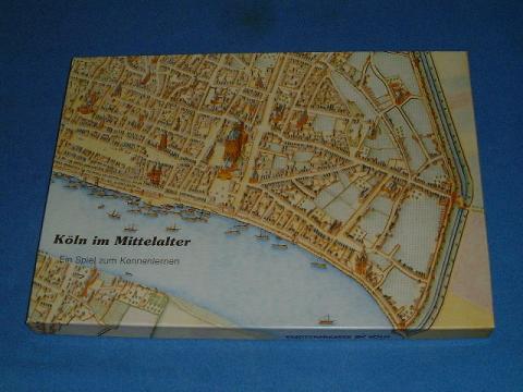 Werbespiel der Stadsparkasse Köln, Mechanismus Lauf/Würfelspiel mit Ereignisfeldern und Quizfeldern, Plan gestaltet nach der Mercator-Karte von Köln, das Spielheft kann auch als Grundlage für Geschichtsunterricht zum Thema verwendet werden. Aufwendig gestaltet.