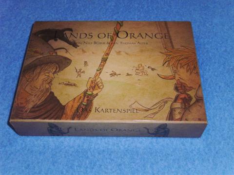 Die Länder von Orange sollen unter einer Herrschaft vereint werden. Dazu wählt jeder Spieler seinen Helden; Spielfeld, Aktionskarten-Stapel und Kreaturen-Stapel werden vorbereitet. Der gegnerische Held soll durch Reduzieren aller Lebenspunkte besiegt werden. Dazu versammelt man Einheiten aus dem ganzen Land, gibt ihnen Artefakte und nutzt Zaubersprüche. Die Einheiten werden auf dem Plan eingesetzt und verschoben. Jeder Spielzug besteht aus drei Phasen, zuvor müssen immer den Riesen, die andere Einheiten schützen, vier Lebenspunkte abgezogen werden. Der Zug selbst besteht aus der Verstärkungsphase mit einer Aktion - Einheit und/oder zwei Aktionskarten, Aktionskarte abwerfen, Einheit opfern, Kreatur auf Reservestapel legen oder Kreatur im Feld mit Kreatur vom Reservestapel tauschen. Danach folgt die Kampfphase mit Einheiten bewegen und Angriff sowie die Nachzugphase. Einheiten gewinnen Erfahrung durch Kampf und auch der Held gewinnt an Erfahrung, was ihn befähigt, später mächtigere Einheiten einzusetzen und mit anderen Einheiten zu kombinieren. Das Spiel verlangt geschickte Kombination der Möglichkeiten, starke Handkarten funktionieren nur mit Erfahrung, wer sich weit vorwagt, verliert, wer zu defensiv bleibt, gewinnt keine Erfahrung - also heißt es gut überlegen und die von Zauber- und Aktionskarten sowie Artefakten offerierten Möglichkeiten gezielt und im richtigen Moment einsetzen. Gängiges Thema, Standard-Mechanismen wie Nützen von Zaubersprüchen, Waffen und Kreaturen, aber durch die Kombinationsmöglichkeit der einzelnen Elemente und den Erfahrungsgewinn bietet Lands of Orange interessantes, eigenständiges Spielerlebnis.