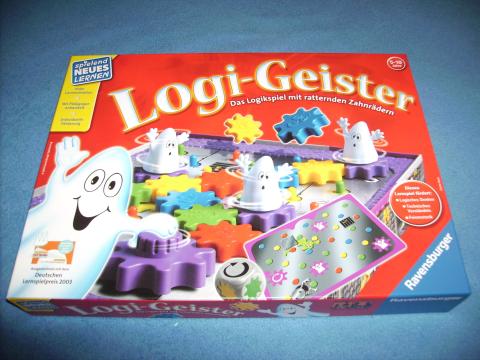 Die Geisterbahn ist kaputt und die Spieler sollen sie wieder in Gang setzen. Jeder setzt seinen kleinen Zählwaggon auf das Startfeld am Schachtelrand, die Bauplankarten werden gemischt und verdeckt bereit gelegt. Dann wird die oberste Bauplankarte umgedreht: Sie zeigt die Geisterbahn, die repariert werden soll und gibt den Platz für die lila Zahnräder und die Gespenster vor. Das lila Rad ohne Gespenst darauf ist das Drehzahnrad der Runde. Dann wird reihum gewürfelt und bei einem Zahnradsymbol ein passendes Rad aufgesteckt oder versetzt, und zwar so lange bis man einen Drehpfeil oder eine Fledermaus würfelt. Wer einen Drehpfeil würfelt, kann versuchen die Geisterbahn zu starten und darf für jedes Gespenst das sich dreht, die Spielfigur ein Feld weiterziehen. Das Fledermaus-Symbol beendet den Zug, der Nächste ist dran. Wer sicher ist, dass er die Geisterbahn repariert hat, dreht das lila Drehrad sofort ohne würfeln nach dem Einsetzen eines Zahnrads – drehen sich alle 3 Gespenster, zieht die eigene Figur 4 Felder weiter. Gespenster und Zahnräder werden abgeräumt, die nächste Bauplankarte wird aufgedeckt und die vier lila Zahnräder und die drei Gespenster für die neue Geisterbahn eingesetzt. Wer mit seiner Spielfigur als erster im Ziel ist, gewinnt. In der Profi-Variante zieht jeder Spieler seine eigene Karte. Auch in der Neuauflage ein gelungenes Spiel, die Idee ist entzückend und kindgerecht umgesetzt worden, die Neuauflage in der Reihe Spielend Neues lernen ist gerechtfertigt und der Deutsche Lernspielpreis verdient.