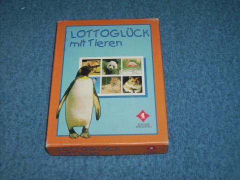 6 Bildkarten und 36 Bildkärtchen mit Tieren Standard-Lotto-Spiel, es gewinnt, w er zuerst seine Tafel belegen kann Regel am Schachtelboden