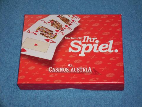 Machen Sie Ihr Spiel Normales Rummy-Deck, Rückseiten schwarz und Rot, jeweils mit Casino-Logos Werbegeschenk zur Charity Gala „Monopoly Manager of the Year“ 2006 Ludografische Angaben Verlage: Casinos Austria Inventarnummer: 16377 Kategorien: Karten, Werbe Erscheinungsjahr 2002 Spieler 2 - 8 Spieler Alter 8 - 99 Jahren Dauer bis 45 Minuten