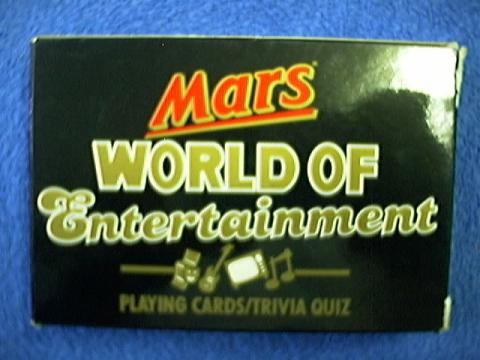 Mars WORLD OF Entertainment Werbespiel mit Spielkarten, die gleichzeitig Frage- und Antwortkarten für ein Trivia-Spiel sind. Ludografische Angaben Verlage: MARS Inventarnummer: 10840 Kategorien: Karten, Quiz, Werbe Erscheinungsjahr 1988 Spieler 2 - 4 Spieler Alter 8 - 99 Jahren Dauer bis 30 Minuten