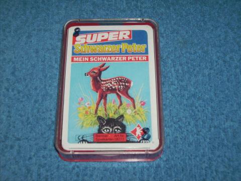 15 Kartenpaare mit Tiermotiven + Schwarze Katze als Schwarzer Peter gespielt wird nach den klassischen Regeln für Schwarzer Peter Kartenrückseite rot, darin Smileys rot auf weiß, offener Mund und rote Wangen Deckblatt Bambi und Schwarzer Katzenkopf., über dessen unterer Hälfte Balken mit Artikelnummer Enthält identisches Deckblatt mit veränderter Beschriftung im Artikelnummerbalken und Schmidt Spiele Logo, auf dem Dosenboden EAN-Code von Berliner Spielkarten Dose, flach, rot