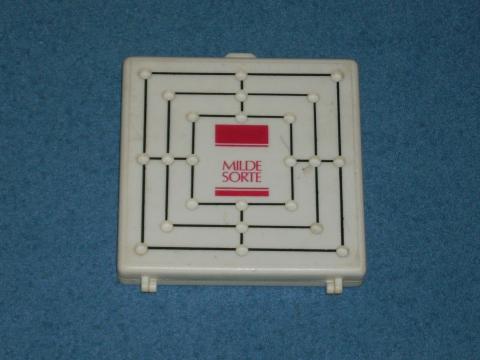 Mini-Spielsammlung mit Material für Mühle, Dame und Mensch ärgere Dich nicht. Plastikdose, außen mit Vertiefungen für Spielfiguren, und Zeichnungen für Brett, innen Material und ein kleines Paket doppeldeutscher Schnapskarten, Verpackung mit slowaksicher Aufschrift und Adresse in Bratislava