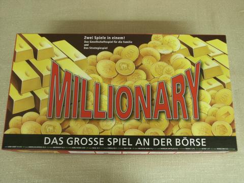 Mit MILLIONARY kann man das reale Börsengeschehen in vereinfachter Form erleben. Die Spieler kaufen und verkaufen Aktien und beeinflussen damit die Kurse, hoffentlich immer zum eigenen Vorteil. Die Brisanz liegt im Handel mit Optionsscheinen. Durch diese sehr spekulativen und riskanten Geschäfte kann man höchste Gewinne erzielen, aber auch alles verlieren. Alle Änderungen werden in Anzeigetafeln mit Zahlen ausgedrückt. Die Regel bietet eine Familienvariante als Würfelspiel und ein Strategiespiel ohne Würfel, dazu 3 komplette Musterspiele.