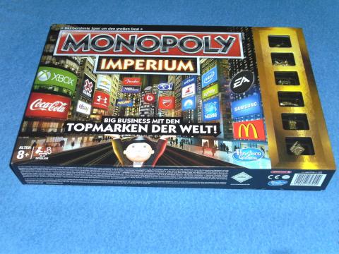 A new variant of Monopoly, a new version of the classic game - we no longer trade in real estate, but trade in world-famous trademarks, like Coca Cola or Intel or McDonalds. Each player starts with a tower and two Empire cards, this is the name for the Community cards in this version. In your turn you roll - when you achieved the "Clever Swapper" you can swap the top brand sign in any tower with the top sign in any other tower, but this ends your turn. When you do not want to swap, you use the result of the other die and implement the instructions of the square you reached. On brand name squares where the brand sign is still available you buy the sign or auction it; signs that you acquire by buying or auction you place into your tower. Should the sign already be owned by another player, you pay him the currently visible value of his tower. If you own all brands of one color you get a free Office sign for your tower, but you can also buy one of those Office signs for money. For Water and electricity signs can be bought or auctioned, but earn you now rent. ON a spot "Opposition tower tax" or "Tower Tax" you or one of your opponents must give back the top sign in the tower. Cards drawn on Event and Imperium squares are implemented. You can buy yourself out of gaol and you cannot go bankrupt, but have to give away the topmost sign in your tower to the bank or another player if you cannot pay the bank or another player. If you are first to fill your tower completely, you win. This is a very attractive variant, also as regards to components, familiar and yet different, and offering the familiar fun for the whole family!