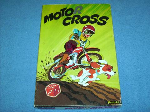 Lauf/Würfelspiel mit Motorrad-Rennthema, Ereignisfelder markiert, Bedeutung nicht angegeben. Die Figuren sind Scheiben auf Füßen.