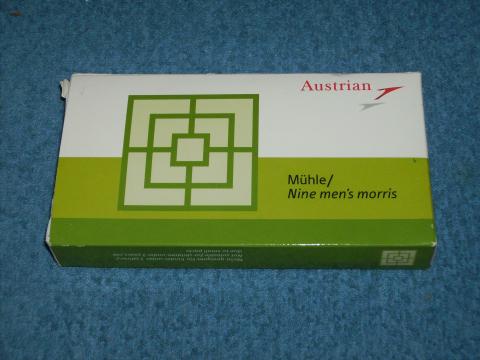 Mühle mit Standardregeln in zwei Sprachen, Kassette aus Spielbrett, Brett grün, Steine gelb und rot, magnetisch. Auf Innenseite der Kassette beidseitig Reg.Nummern aus England und China. Keinerlei Herstellerangaben