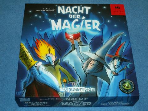 Nacht der Magier ist das erste Brettspiel, das man im Stockdunkeln spielt. Um einen stimmungsvollen Feuerplatz auf einem erhöhten Spielfeld treffen sich vier hölzerne Magier, auf deren Zauberhüten geheimnisvolle Zeichen leuchten. Abwechselnd versucht jeder Magier, einen seiner drei Zauberkessel Richtung Feuer zu schieben. Da wird gerückt, gedrängelt und geschoben – und Bäume, Steine und Kessel bewegen sich wie von Geisterhand. Nur ein Klack verrät, dass etwas vom Felsen stürzt. Landet ein Zauberkessel im Lichtring, hat sein Besitzer gewonnen.